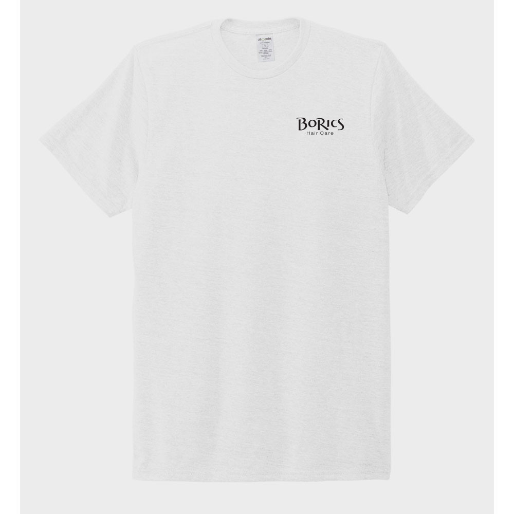 Feel your impact in this crazy-soft sustainable tee that uses an equivalent of up to 6 recycled plastic water bottles. 4.2-ounce, 50% recycled polyester, 25% organic ring spun cotton, 25% modal. Carbon footprint neutralized through the ClimeCo Certified Productâ„¢ Program. 1x1 rib knit neck. Shoulder to shoulder taping. Side seams. Recycled tear-away label.