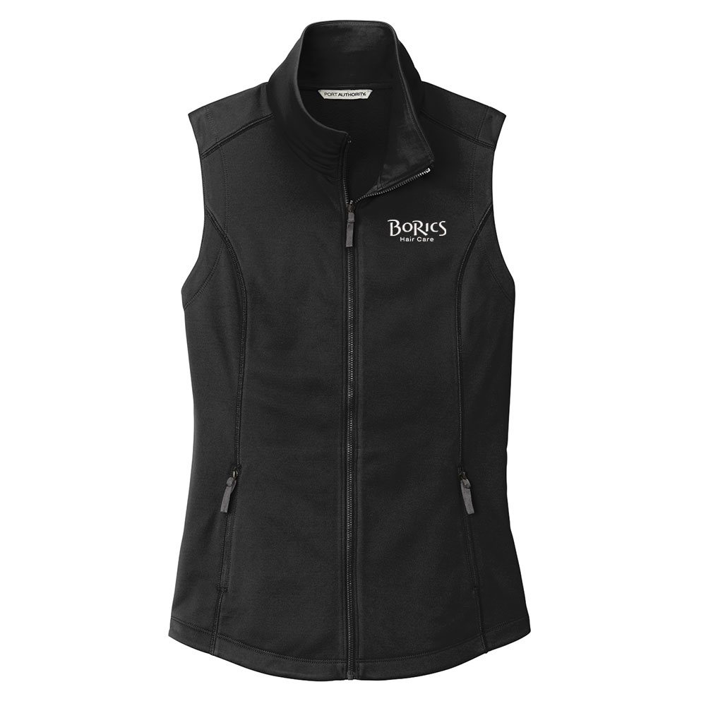 5.9-ounce, 100% polyester fleece. Dyed-to-match and contrast coverstitch. Slightly longer length. Ruching at collar. Molded center front zipper. Front reverse-coil zippered pockets. Tulip hem.