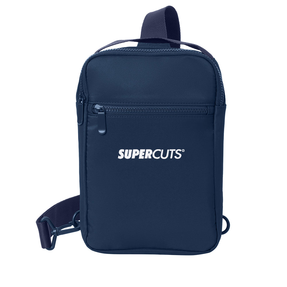 Smooth matte polyester with knitted cloth. Zippered main compartment. Dyed-to-match metal zipper pulls. Front zippered pocket. Dyed-to-match molded zippers. Adjustable ambidextrous webbing shoulder strap. Web carry handle. Dimensions: 11"h x 7"w x 2.25"d. Capacity: 244 cu. in./4 L. Weight: 0.4 lbs./0.2 kg.