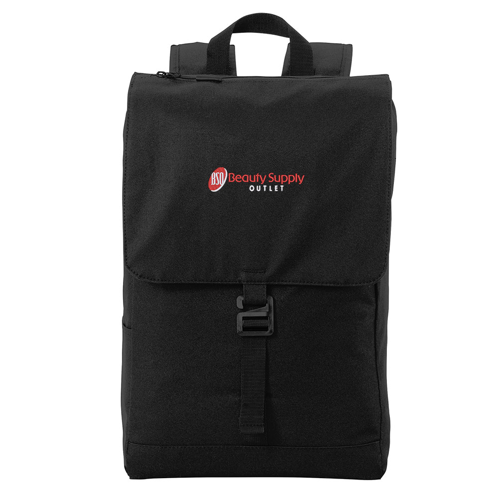 600D poly canvas. Main compartment with padded laptop panel. Interior organization pockets. Front zippered rucksack flap. Hook closure on front. Exterior side pocket. Padded air mesh shoulder straps. Luggage trolley pass through on back. Laptop sleeve dimensions: 12"h x 11"w x 1"d; fits most 15" laptops. Dimensions: 17"h x 10.5"w x 5"d; Approx. 893 cubic inches.