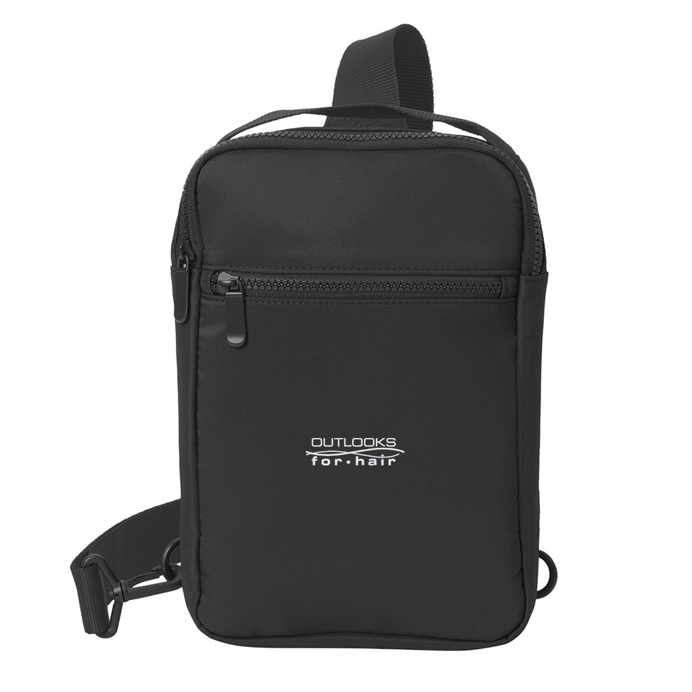 Smooth matte polyester with knitted cloth. Zippered main compartment. Dyed-to-match metal zipper pulls. Front zippered pocket. Dyed-to-match molded zippers. Adjustable ambidextrous webbing shoulder strap. Web carry handle. Dimensions: 11"h x 7"w x 2.25"d. Capacity: 244 cu. in./4 L. Weight: 0.4 lbs./0.2 kg.